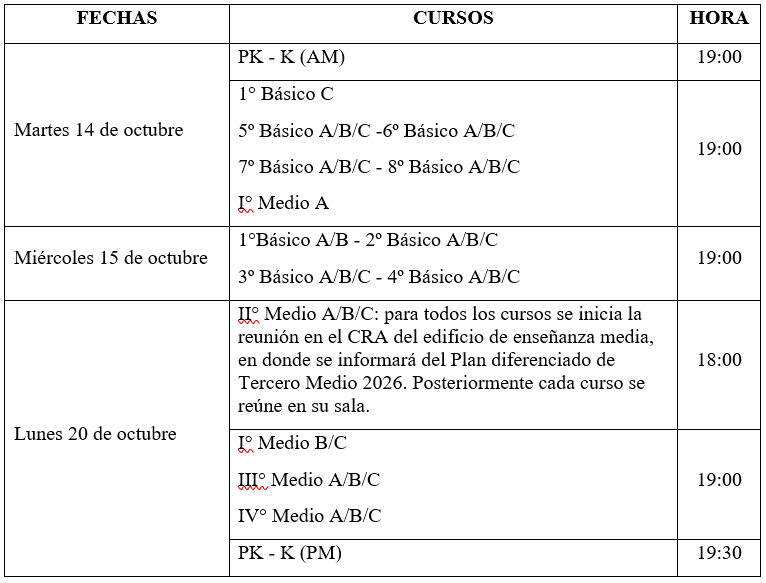 Circular N° 12 – 08 de Octubre 2025 admin 8 octubre, 2025 Circular Estimados Apoderados:Junto con saludarles, informo las fechas de la 5ª reunión de apoderados de este año escolar.Las fechas y horarios de cada curso son las siguientes: Esperamos contar con vuestra presencia en este importante encuentro. AtentamenteLoreto Venegas MoyaRectora Navegación de entradas Anterior Entrada anterior: Circular N° 11 – 02 de Septiembre 2025Siguiente Entrada siguiente: Circular N° 13 – 14 de Octubre 2025