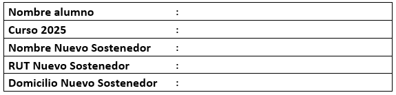 Para los alumnos que cumpliendo los requisitos anteriores deseen cambiar el sostenedor financiero del año 2025, deberán remitir los siguientes antecedentes al correo matriculas@colegiocentenariotemuco.cl